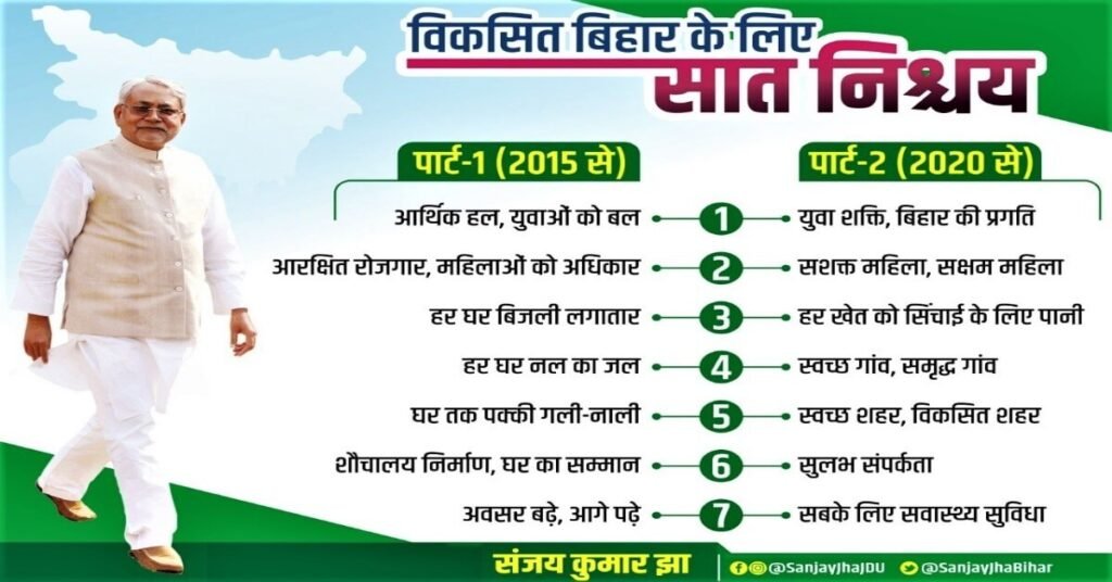 सात निश्चय योजना (7 Nischay Yojna) बिहार सरकार की प्रमुख विकास पहल है जिसकी शुरुआत 2015 में मुख्यमंत्री नीतीश कुमार द्वारा की गई थी, इसका उद्देश्य राज्य में ग्रामीण और शहरी दोनों स्तरों पर बुनियादी सुविधाएं पहुँचाना था।